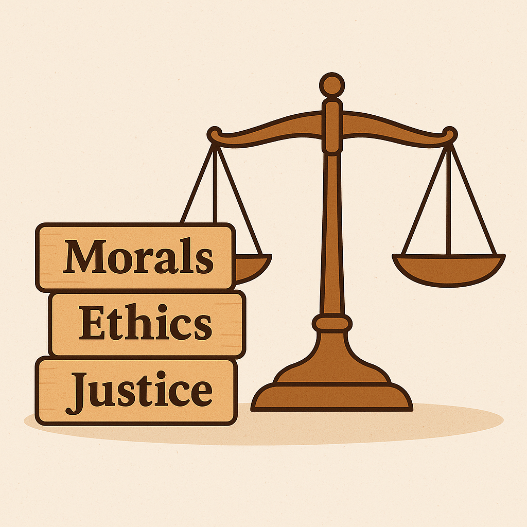 | 정의(Justice) | 사회 구성원 모두에게 공정한 절차·권리·분배를 보장하는 제도적 기준입니다. 예: 동일노동 동일임금, 공정한 재판, 복지의 형평성. 포인트: 도덕·윤리의 논의를 사회 시스템으로 구체화합니다. |